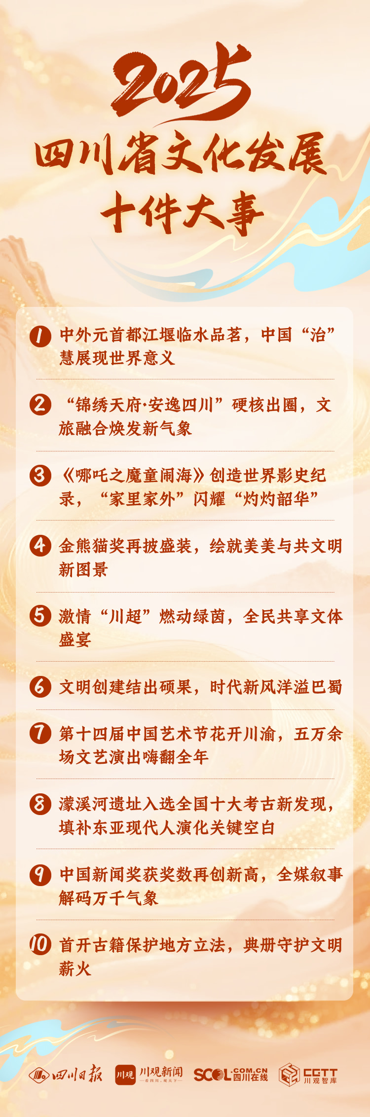 为深入学习贯彻习近平文化思想,集中呈现四川文化事业产业繁荣发展最新成果,四川省委宣传部会同有关部门(单位)和市州等组织开展了2025四川省文化发展十件大事征集评选活动。经提名推荐、媒体推选、专家评审等环节,2025四川省文化发展十件大事集中发布。