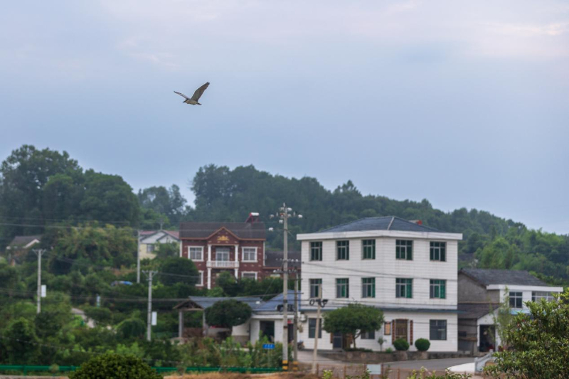 7月25日,湖北省宜都市五眼泉镇鸡头山村,一只苍鹭展翅飞过。新华网 钟奕 摄