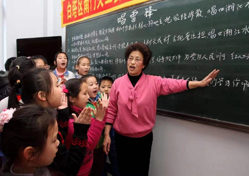 唐革军与孩子们共唱学雷锋歌曲。(来源:辽阳政协微信公众号)