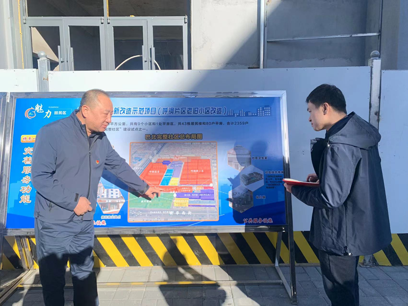 10月19日,“文明中国”主题采访报道组在呼和浩特市回民区呼钢小区调研,这是工作人员在向记者讲述呼钢片区老旧小区改造的布局规划。新华网 张倩 摄
