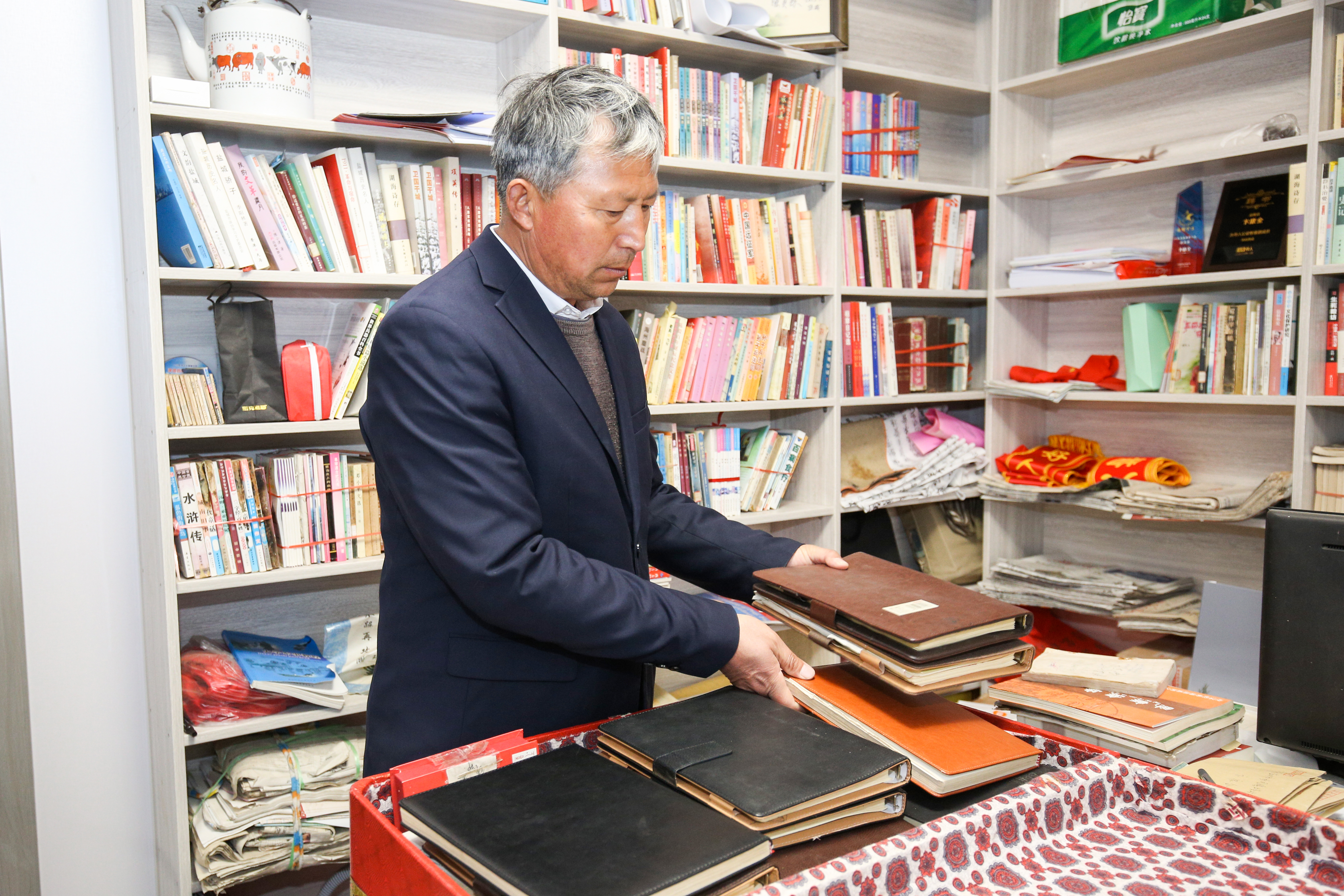 卞康全在整理工作笔记本。盐城市委宣传部 供图