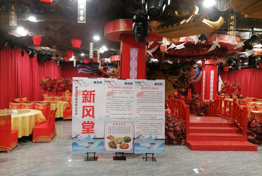 为彻底摒弃婚丧嫁娶等陋习,桃园村不仅将村规民约等绘成文化墙,让村民随时随地可见,还成立红白理事会,走村入户进行宣传移风易俗知识,倡导喜事小办丧事简办,村民随礼限额度。“红白喜事严控标,每桌一百不许超。”随着移风易俗宣传活动的不断开展和深入,群众的思想观念得到了很大程度的转变。村里2021年建设的新风堂不仅是全村操办红白喜事酒席场所,也成为村里移风易俗宣传阵地、便民利民宴会中心、文明乡风示范基地,成为村民家门口的“宴会中心”。“我儿子今年结婚就是在新风堂办的喜酒,这里地方大,气氛好,卫生方便,既省了钱,又吃得开心,体面实惠!”村民乐呵呵地说。如今,随着移风易俗意识的深入,新风堂里越发热闹了,越来越多的人选择喜事新办、白事简办,村里社会风尚更加浓厚,村民人情费支出明显减轻,乡风文明程度进一步提高。