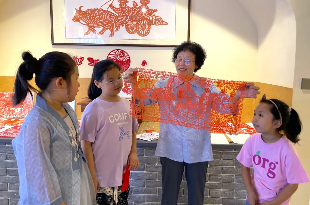 8月8日,在静乐县新时代文明实践中心,市级非遗剪纸传承人李计娥正在给孩子们展示剪纸作品。新华网 任钰 摄