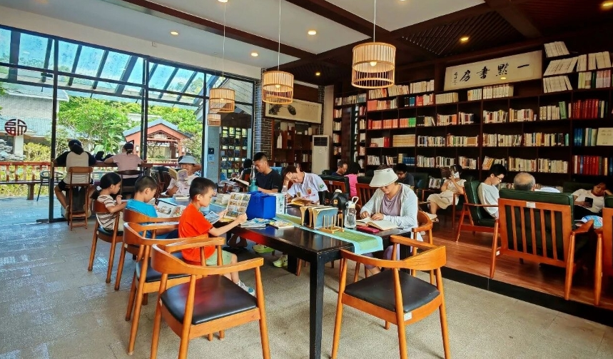 夏日的岭南书院(江心岛书院)里,阳光透过翠绿的树叶洒下斑驳光影。宽敞明亮的公共书房内,微风轻拂,书香弥漫。人们或坐或倚,沉浸在书海之中。