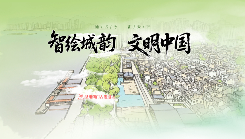 以浙江温州六个文化地标千年古港、国旗馆、道德馆、江心屿、城市书房、五马街为元素,彰显文化书院、城市书房、历史文化街区等城市文化之美。
